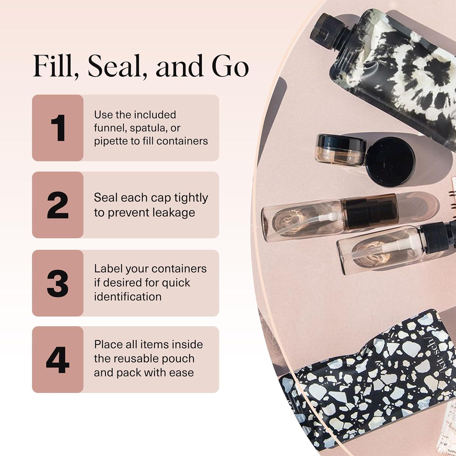 COMPLETE 11-PIECE TRAVEL KIT – EVERYTHING YOU NEED FOR YOUR BEAUTY ROUTINE – This travel size container set includes everything you need to store and carry your beauty and grooming products. It features 1 x 30ml spray bottle, 2 x 30ml pump bottles, 2 x 0.35oz mini jars, 3 x 90ml flat pouch bottles, and 1 x 1qt reusable travel pouch, along with mini funnel, mini spatula, and mini pipette. This versatile travel bottles for toiletries kit is perfect for shampoos, conditioners, lotions, oils, and other liquids.
